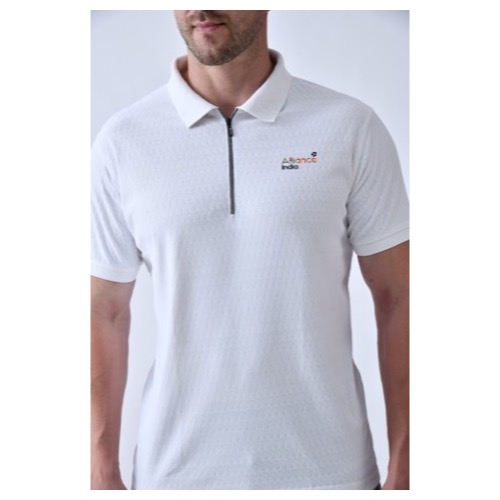 Jacquard Collar Zipper Style Fabric: Hexa Grain Base Colour: White Features: Sweat Absorbent, Contrast Band