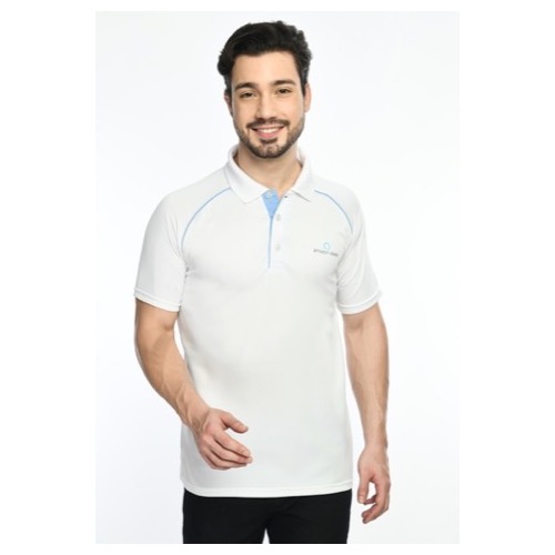 Contrast Bone and Sleeve Piping Fabric: Dot Knit Mesh (Eco Polo) Base Colour: White Features: Sweat Absorbent, Contrast Band