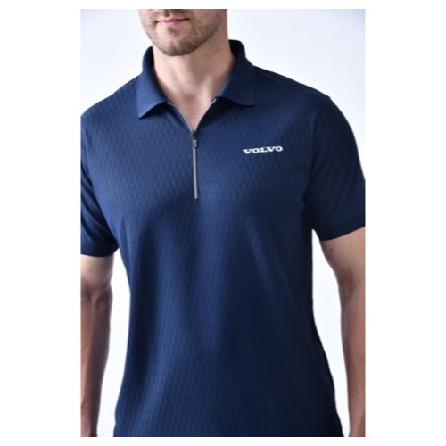 Jacquard Collar Zipper Style Fabric: Hexa Grain Base Colour: Navy Blue Features: Sweat Absorbent, Contrast Band